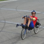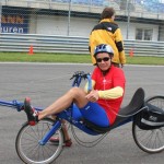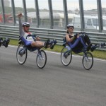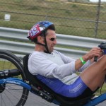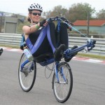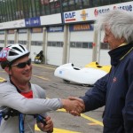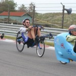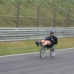 Voor het eerst in jaren eens een uursrace zonder dat ik de dag vooraf al drie of zes uur geraced heb. Ik weet eigenlijk ook zelf niet meer wat voor hartslag ik op mijn oude dag nog een uur vol kan houden. Ik neem mij voor om dat dit uur dan maar eens uit te proberen: gewoon goed gas geven maar mezelf net niet helemaal kapot rijden zodat ik ’s middags toch nog vier uur achter Rosemarie aan kan plakken. Rosemarie Boehler is een Zwitserse ligfietsdame die met haar staartpuntje mij al een keer of drie eerder door een wedstrijd heeft gesleept. Ze heeft een uiterst vriendelijke rijstijl, super constant en nooit tussensprintjes. Haar persoon is geloof ik even vriendelijk als haar rijstijl. Dat uur blijk ik rond de 160 toch nog wel te kunnen draaien en ik let alleen maar op die hartslag en de bochten waarbij ik slechts af en toe op de teller kijk. Het circuit van Zandvoort is wel echt leuk om op te rijden; er is ons voor de start door de wedstrijdleiding niets meegedeeld, dus ook niet of je rechts of links moet houden. Na dat eerste rondje begrijp ik waarom: je hebt de volle baanbreedte nodig om de bochten fatsoenlijk aan te snijden. Als je bochtenlijn goed is hoef je nergens te remmen en kan je haast in iedere bocht doorroeien. Wat ik mij herinner van twintig jaar terug, toen er ook een ligfietswedstrijd op het circuit was, is het uiterst ruwe asfalt waar je met de fiets nauwelijks snelheid op kon maken. Dat hebben ze dus effe veranderd, dit asfalt rolt prima, ook op die smalle fietsbandjes. Ik zie toch snelheden van meer dan 54 km op de teller van mijn THYS 240 staan als ik een stuk met rugwind net ietsjes duintje af roei richting Renault bocht. Voor die bocht moet je iets inhouden en kijken of er niet zo’n snelle ligfietskuip in je achteruitkijkbrilspiegel opduikt. Een mooi moment om je bidon te pakken en even wat hoognodig vocht naar binnen te werken zonder dat je dit extra tijd kost. Een enkele keer ga ik even in de remmen voor zo’n driewielige Quest met volle kunstofkuip . Zo’n volle kuip die de binnenbocht wil pakken, daar heb ik dus mooi geen zin in, beneden de wind en in de buitenbocht ten opzichte van zo’n driewieler, ik vertrouw ze voor geen cent; voor je het weet liggen ze plat en heb je ze op schoot.