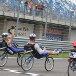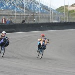 De volgende dag was meer van hetzefde maar dan toch weer anders. Er zat door die bukkers erg veel wachten in en het eindigde met het roeifietsrondje. Dit vond ik toch weer erg leuk, mede omdat Arthur ten Katen er opeens weer bij was en die kan nogal lekker doorroeien. Dus het was geen 1-2tje tussen Martijn en mij, want Arthur ben je zomaar niet kwijt. Ik zit nu net als Martijn op een THYS 222 CVT met twee kleine 20 inch wielen en Arthur op zijn best wel oude 222 met niet optimaal werkende schakeling. Arthur schakelt gewoon niet. Vanaf het begin doet Martijn duidelijk het meeste kopwerk en ik heb vooral in het klimmetje moeite om bij te blijven. Ik moet ver terugschakelen en in een hoog slagtempo klimmen, anders lopen de benen geheel vol met melkzuur voorzover daar nog meer bij kan. Dat Arthur nog zo op de macht in zwaar verzet naar boven kan begrijp ik nog, hij komt immers fris aanzetten en heeft die andere races niet meegereden. Maar ook Martijn gaat in zwaar verzet naar boven. Ik heb weinig benul van tijd want mijn hersens werken nog steeds beperkt en ik vergat mijn klokje op nul te zetten. Tegen het einde zit ik op kop en ik denk nog een ronde te moeten doen, maar laat mijn tempo al vallen zodat ik hoop nog mee te kunnen sprinten als er iemand gaat. In het klimmetje voor het rechte stuk zet Martijn akelig hard aan en ik probeer hem te volgen hetgeen net niet lukt. Het blijkt al de finish te zijn en Martijn wint verdient de roeifietsronde en ik vermoed dat dit niet de laatste keer is dat ik uitzicht op zijn achterband heb….