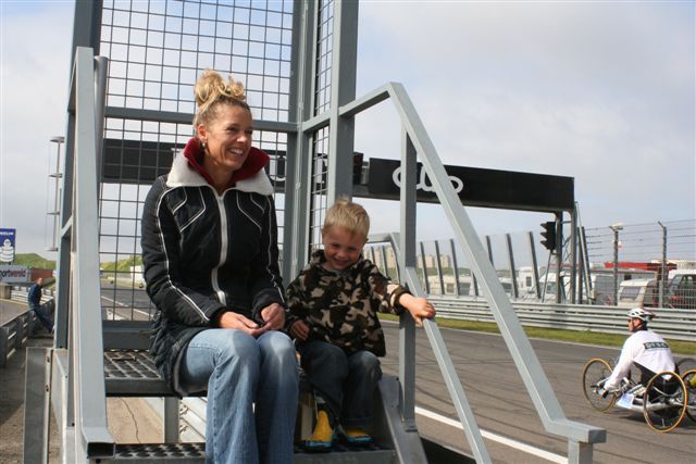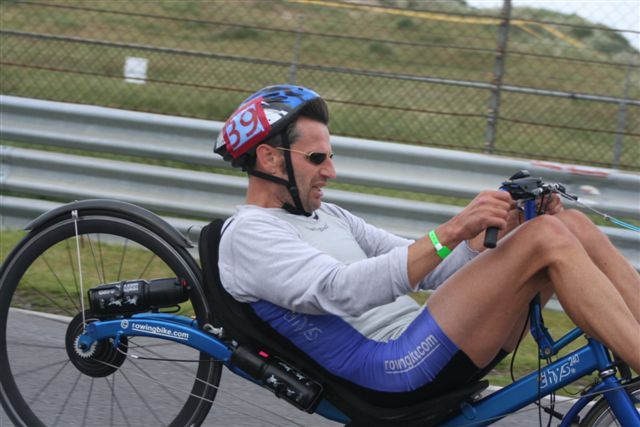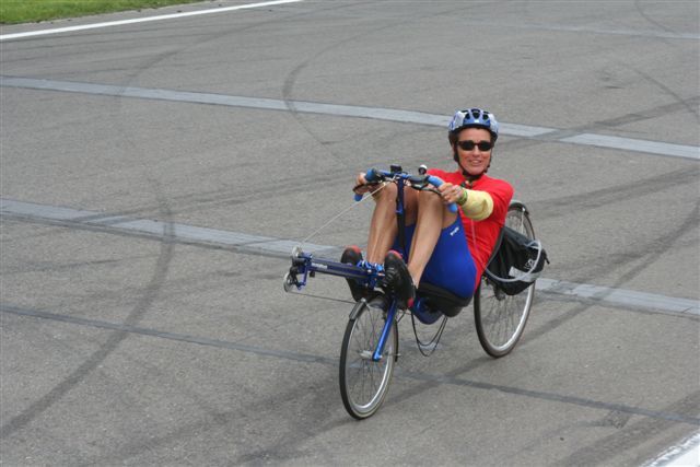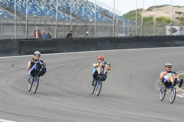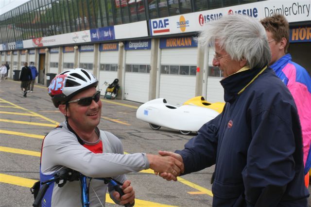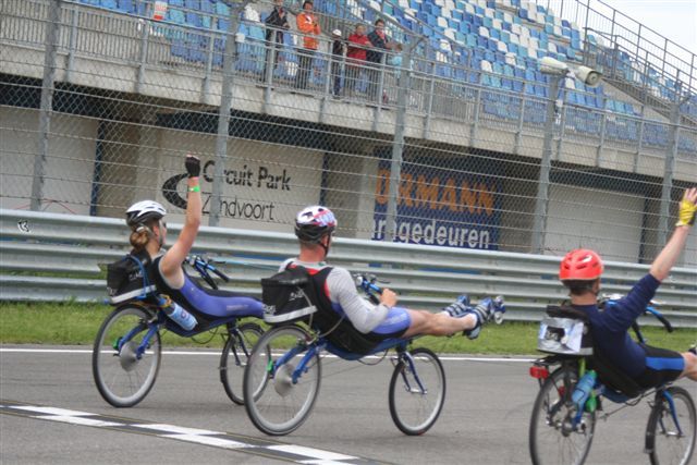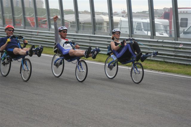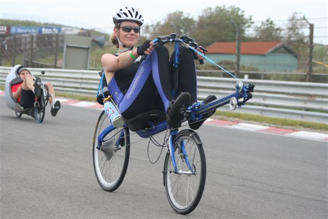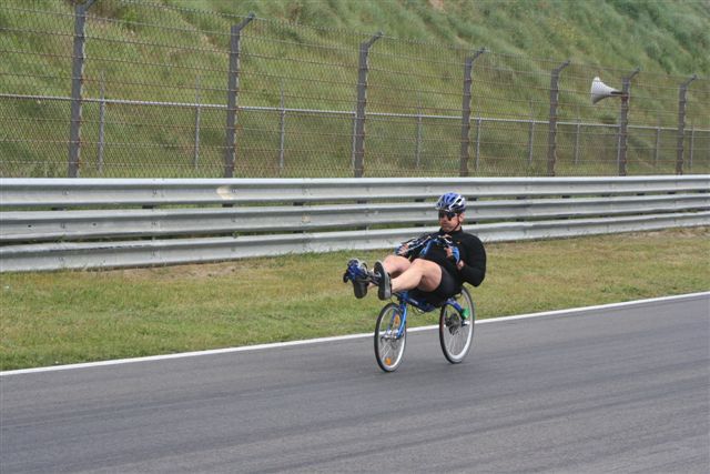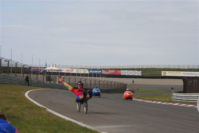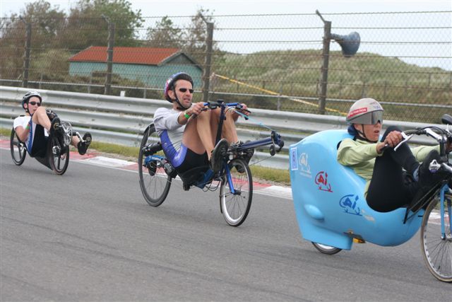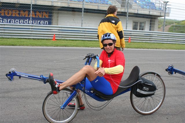 Voor het eerst in jaren eens een uursrace zonder dat ik de dag vooraf al drie of zes uur geraced heb. Ik weet eigenlijk ook zelf niet meer wat voor hartslag ik op mijn oude dag nog een uur vol kan houden. Ik neem mij voor om dat dit uur dan maar eens uit te proberen: gewoon goed gas geven maar mezelf net niet helemaal kapot rijden zodat ik ’s middags toch nog vier uur achter Rosemarie aan kan plakken. Rosemarie Boehler is een Zwitserse ligfietsdame die met haar staartpuntje mij al een keer of drie eerder door een wedstrijd heeft gesleept. Ze heeft een uiterst vriendelijke rijstijl, super constant en nooit tussensprintjes. Haar persoon is geloof ik even vriendelijk als haar rijstijl. Dat uur blijk ik rond de 160 toch nog wel te kunnen draaien en ik let alleen maar op die hartslag en de bochten waarbij ik slechts af en toe op de teller kijk. Het circuit van Zandvoort is wel echt leuk om op te rijden; er is ons voor de start door de wedstrijdleiding niets meegedeeld, dus ook niet of je rechts of links moet houden. Na dat eerste rondje begrijp ik waarom: je hebt de volle baanbreedte nodig om de bochten fatsoenlijk aan te snijden. Als je bochtenlijn goed is hoef je nergens te remmen en kan je haast in iedere bocht doorroeien. Wat ik mij herinner van twintig jaar terug, toen er ook een ligfietswedstrijd op het circuit was, is het uiterst ruwe asfalt waar je met de fiets nauwelijks snelheid op kon maken. Dat hebben ze dus effe veranderd, dit asfalt rolt prima, ook op die smalle fietsbandjes. Ik zie toch snelheden van meer dan 54 km op de teller van mijn THYS 240 staan als ik een stuk met rugwind net ietsjes duintje af roei richting Renault bocht. Voor die bocht moet je iets inhouden en kijken of er niet zo’n snelle ligfietskuip in je achteruitkijkbrilspiegel opduikt. Een mooi moment om je bidon te pakken en even wat hoognodig vocht naar binnen te werken zonder dat je dit extra tijd kost. Een enkele keer ga ik even in de remmen voor zo’n driewielige Quest met volle kunstofkuip . Zo’n volle kuip die de binnenbocht wil pakken, daar heb ik dus mooi geen zin in, beneden de wind en in de buitenbocht ten opzichte van zo’n driewieler, ik vertrouw ze voor geen cent; voor je het weet liggen ze plat en heb je ze op schoot.
