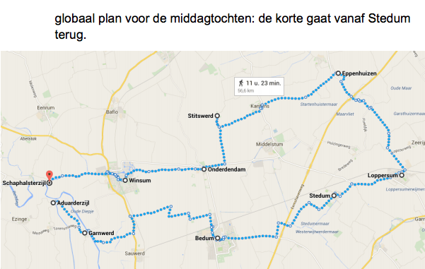 We plannen om zowel ’s ochtends als ’s middags een kortere (plm 30 km) en een wat langere tocht (plm 60 km) te rijden, steeds vanuit de kampeer- en lunchplaats Aduarderzijl. Je kunt dus kiezen tussen 2 lange en 2 korte tochten of je kunt een korte en lange tocht combineren. Elke tocht voert door een ander deel van de provincie Groningen, zoveel mogelijk langs kleine weggetjes.