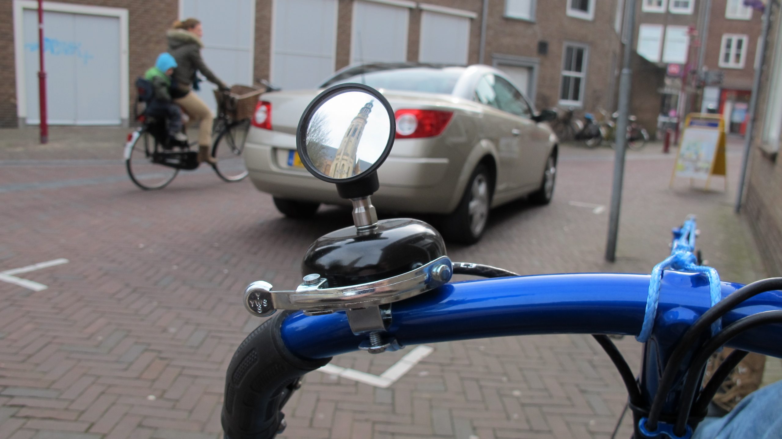 Bij de roeifiets zit de spiegel daar precies goed: boven op de bel. Lekker simpel en degelijk bevestigd met een enkele kogelkop in plaats van de moer en daar klemt het kogelgewricht van de spiegel op.